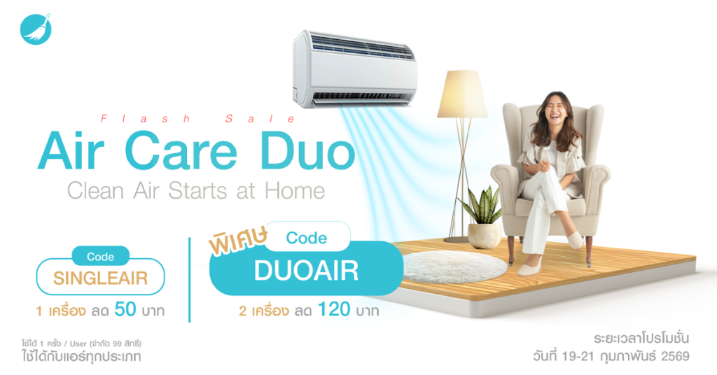 February 17, 2026 🔥Flash Sale – AirCare Duo : Clean Air Starts at Home. 🏠 รับส่วนลดสูงสุด 120 บาท 🔥Flash Sale – AirCare Duo : Clean Air Starts at Home. 🏠 PM 2.5 อยู่ข้างนอก…แต่ “ฝุ่นสะสม” อยู่ข้างในบ้านได้เหมือนกัน 💨 จองบริการ 1 เครื่อง รับส่วนลด 50 บาท…