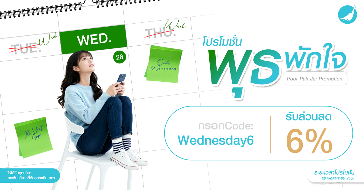 พุธพักใจ (Poot Pak Jai) Promotion 🍀🌿 หยุดพักกลางสัปดาห์ จองบริการแบบสบายใจ 🏡💚ใช้โค้ด [Wednesday6] รับส่วนลดทันที 6%