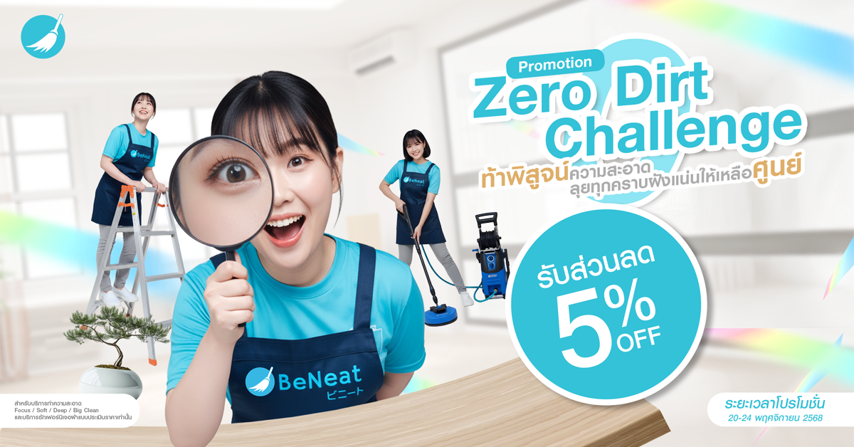 Zero Dirt Challenge Promotion ท้าพิสูจน์ความสะอาด🧽ลุยทุกคราบฝังแน่นให้เหลือศูนย์ 🦾✨เมื่อจองบริการใดก็ได้ SOFT/BIG/Deep Clean, Focus Clean หรือบริการซักเฟอร์นิเจอร์ผ้า (แบบประเมินราคา) รับส่วนลด 5%